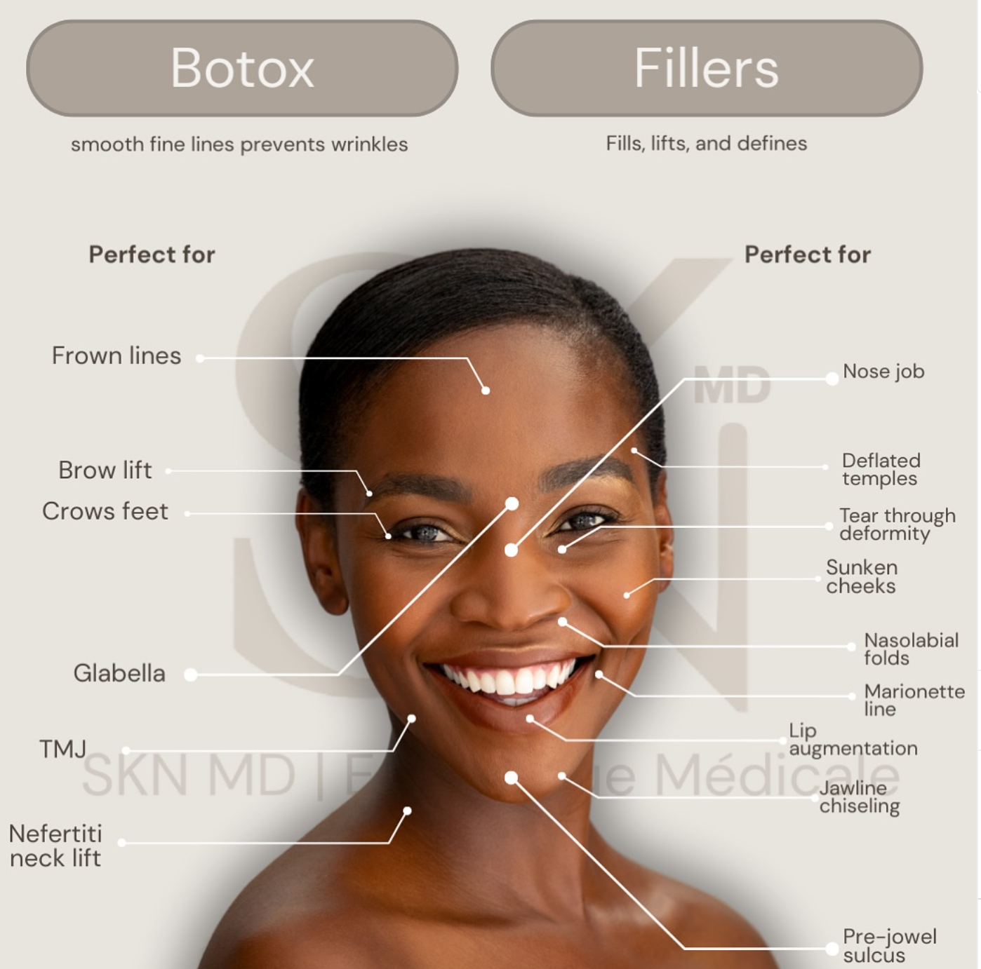 Mainly the face but the neck, hands and buttocks are other areas where we can inject fillers.